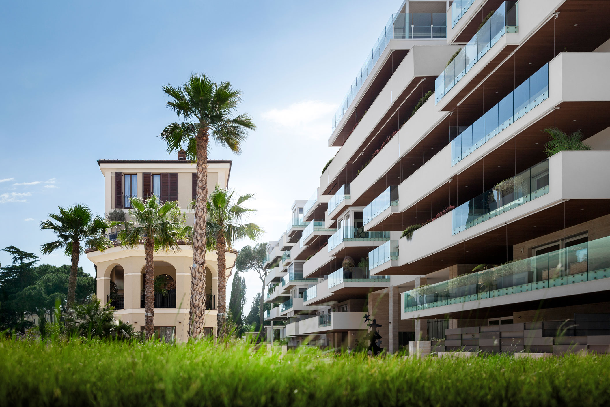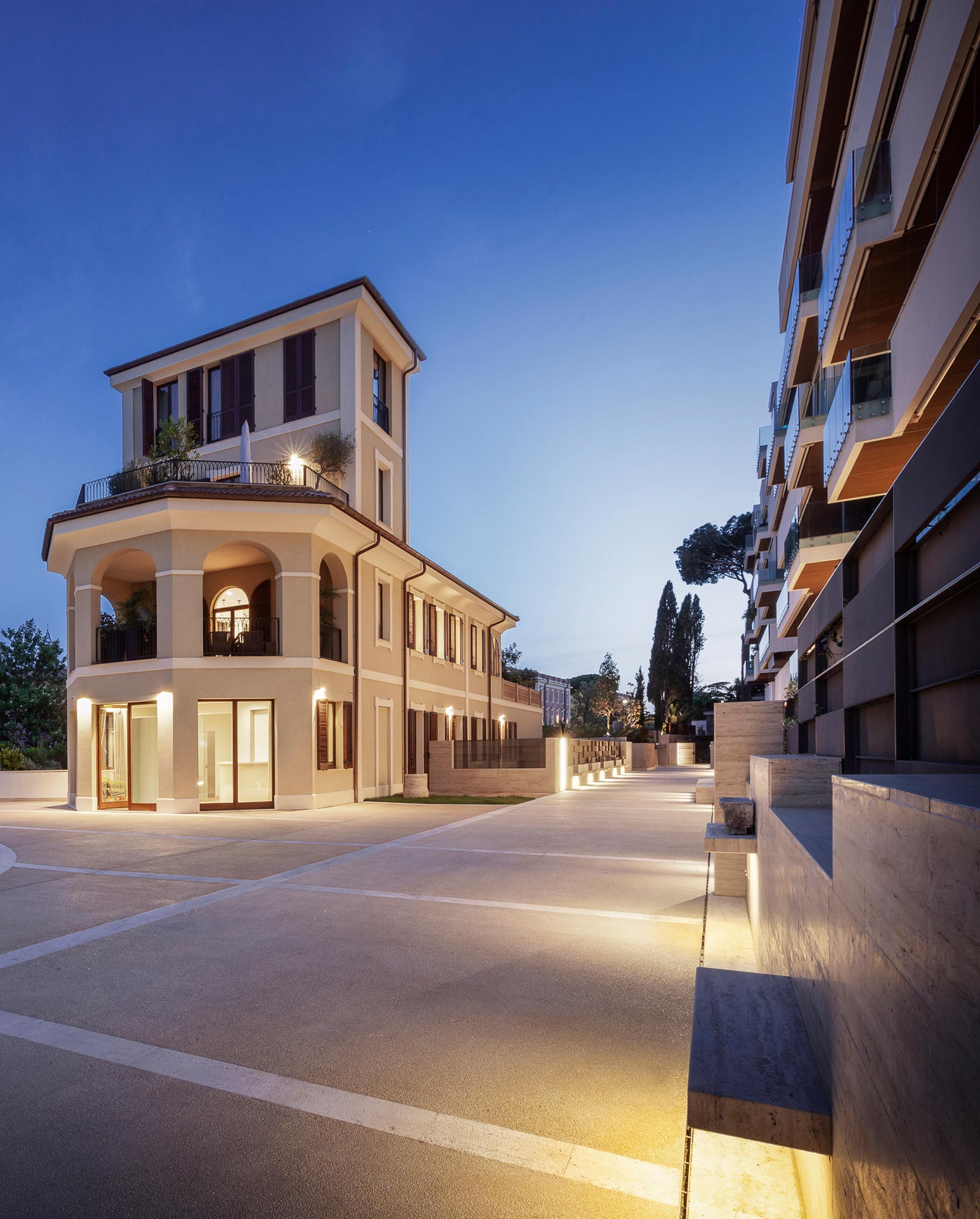 Posizionata al centro del giardino, Villa Pazzi rappresenta il nucleo storico del progetto: con le sue terrazze e i portici ad arco evoca atmosfere mediterranee. Completa l’intervento la villa urbana, declinata in chiave contemporanea e direttamente affacciata sulla Cupola e sulla Città del Vaticano.