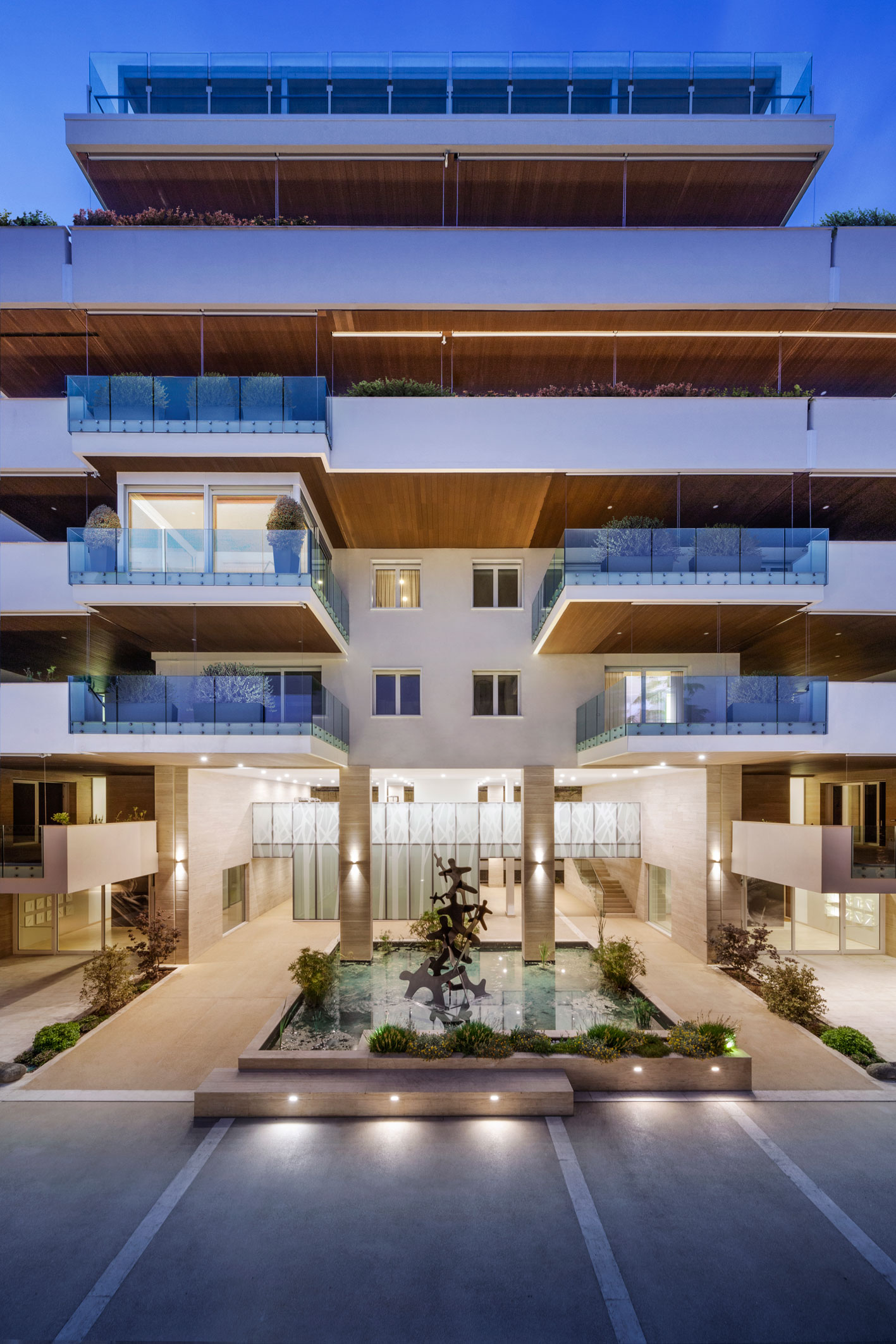 Cuore del complesso è l’elegante edificio in linea: protagonista del disegno del prospetto è il gioco delle terrazze e degli sbalzi, una dinamica alternanza di pieni e vuoti che anima l’affaccio sulla città e sul verde circostante.